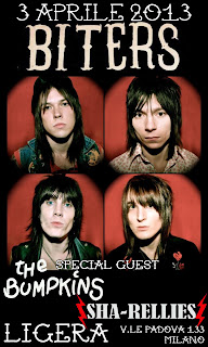 In un Aprile denso di concerti interessanti nei dintorni di Milano, non poteva essere trascurato il passaggio di una delle band più interessanti dell’ ondata powerpop-glamrock-garage-quellochecazzoè tanto in voga ultimamente: i Biters. Ok è un fottuto mercoledì sera e non sono un grandissimo fan del genere ma il quartetto di Atlanta non mi dispiace e mi incuriosisce parecchio, inoltre c’è la riunione dei cari amici Bumpkins, la presenza diventa obbligatoria.